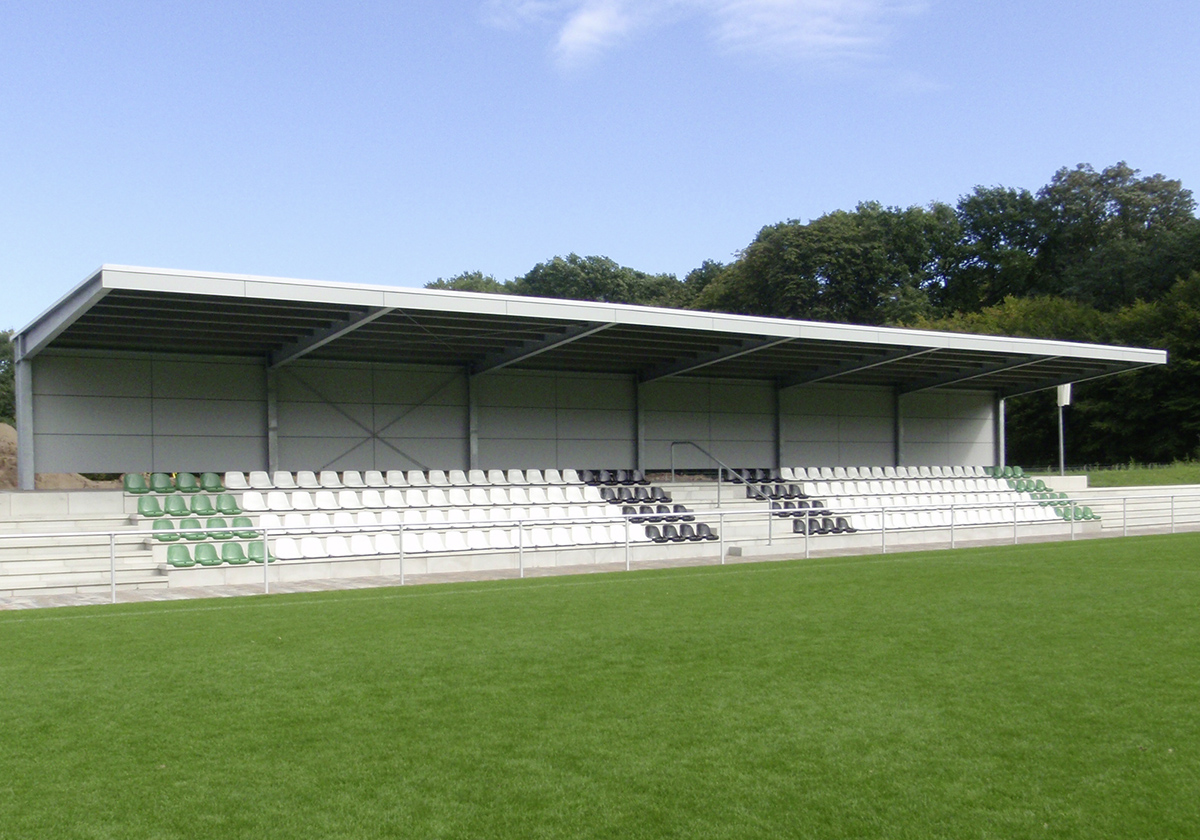 Den Sitzbereich schützt eine Überdachung vor Witterungseinflüssen. Er ist mit in Vereinsfarben gehaltenen Sitzschalen ausgestattet und liegt mittig an der Ostseite des Stadions. Die gesamte Tribünenanlage ist wirtschaftlich aus einheitlichen Betonfertigelementen gebaut worden.