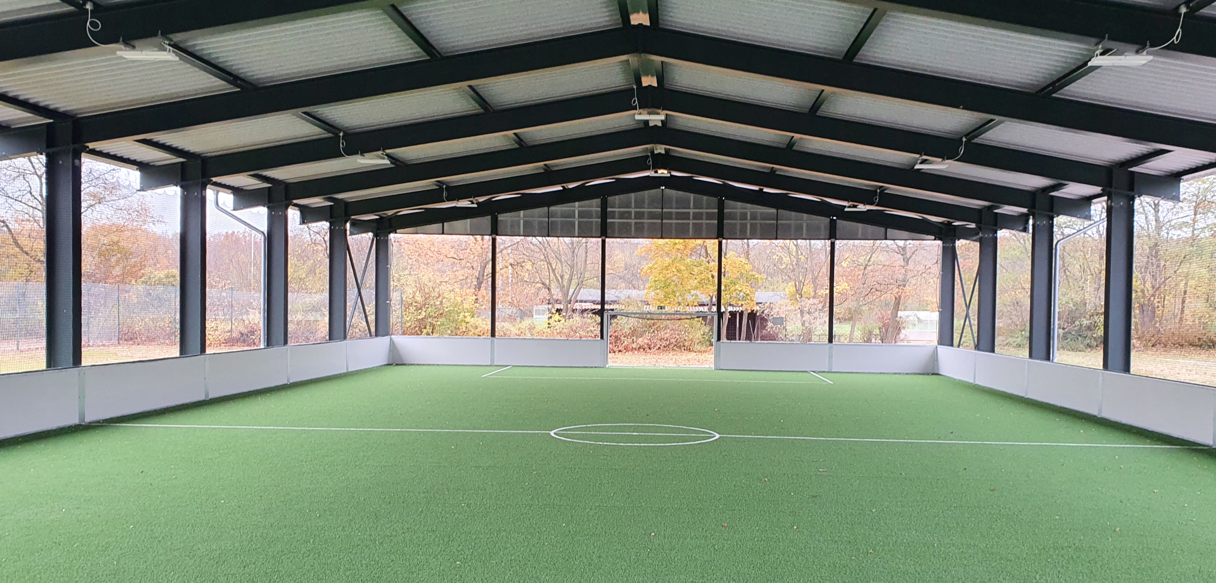 Die Hallen bestehen aus einer Stahlkonstruktion mit gering geneigtem, extensiv begrüntem Satteldach. Ein umlaufendes Bandensystem begrenzt das 20 x 40 Meter messende Spielfeld. Als Ballfangreinrichtung fungiert eine bis zur Unterkante des Daches reichende Netzbespannung. Optional lassen sich nachträglich Seitenwände als Wetterschutz nachrüsten.