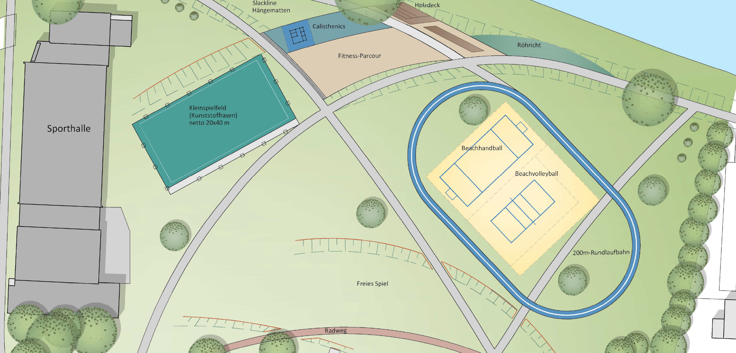 Beide greifen den um die Innenstadt laufenden „Elsebogen“ auf und verbinden das Parkgelände des Elsestadions mit dem angrenzenden Steinmeisterpark. Sie umfassen u.a. ein Boule-Feld, Calisthenics- und Outdoorfitnessgeräte, ein Seilklettergerüst, eine Slackline und ein Kleinspielfeld für Fußball sowie Flächen für Beachsport. Letztere rücken in der Variante 2 als Sandstrand ans Elseufer und werten zusammen mit einer künstlichen Insel den Fluss deutlich auf.