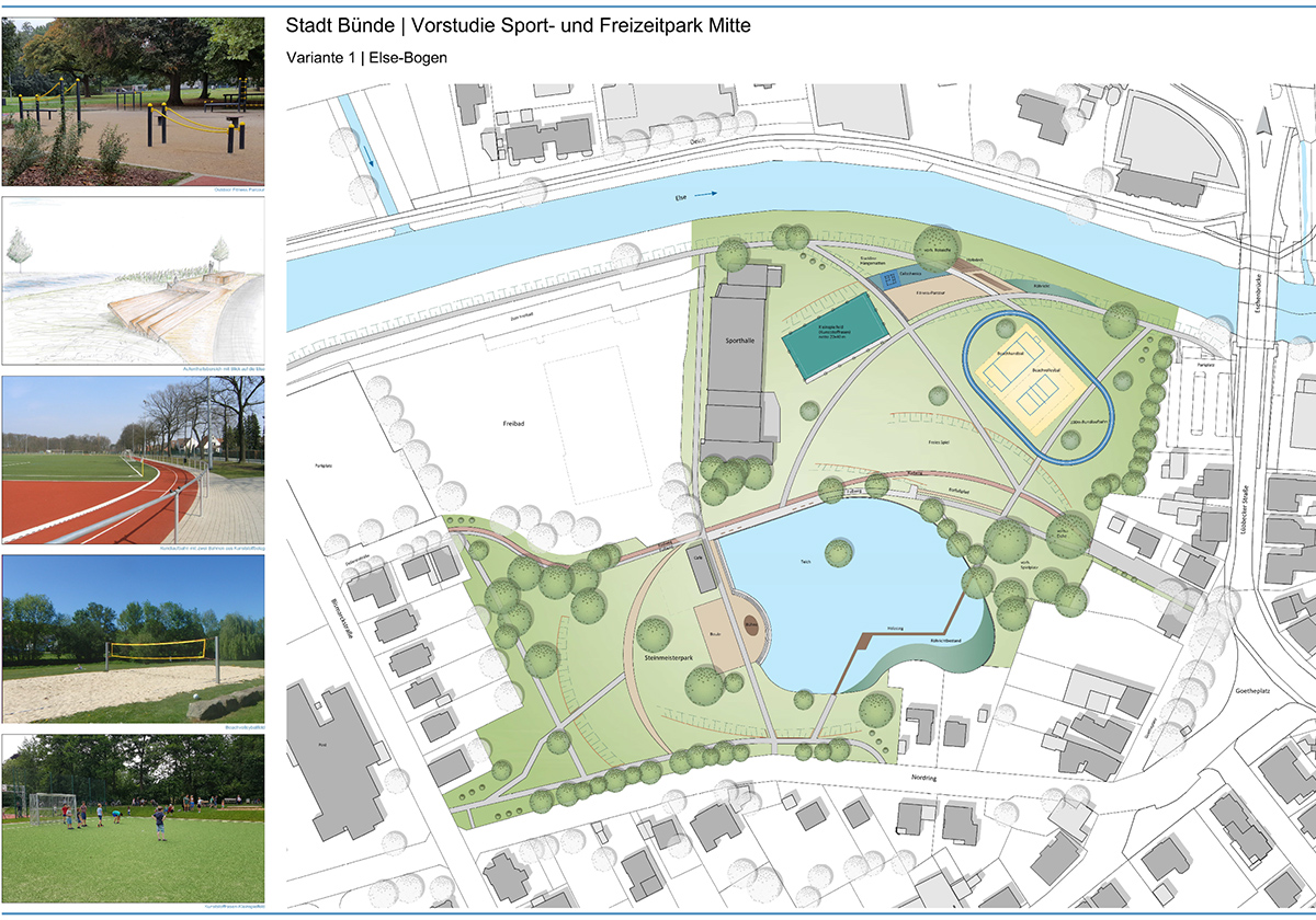 Kann der Sport- und Freizeitwert im Innenstadtbereich erhöht und der Fluss Else erlebbar gemacht werden? Wie diese Planungsziele realisiert werden können, war Gegenstand einer von PS+ durchgeführten Machbarkeitsstudie. Diese untersuchte den von der Stadt Bünde auserkorenen Standort des Elsestadions und unterbreitete zwei Vorschläge für die Umgestaltung.
