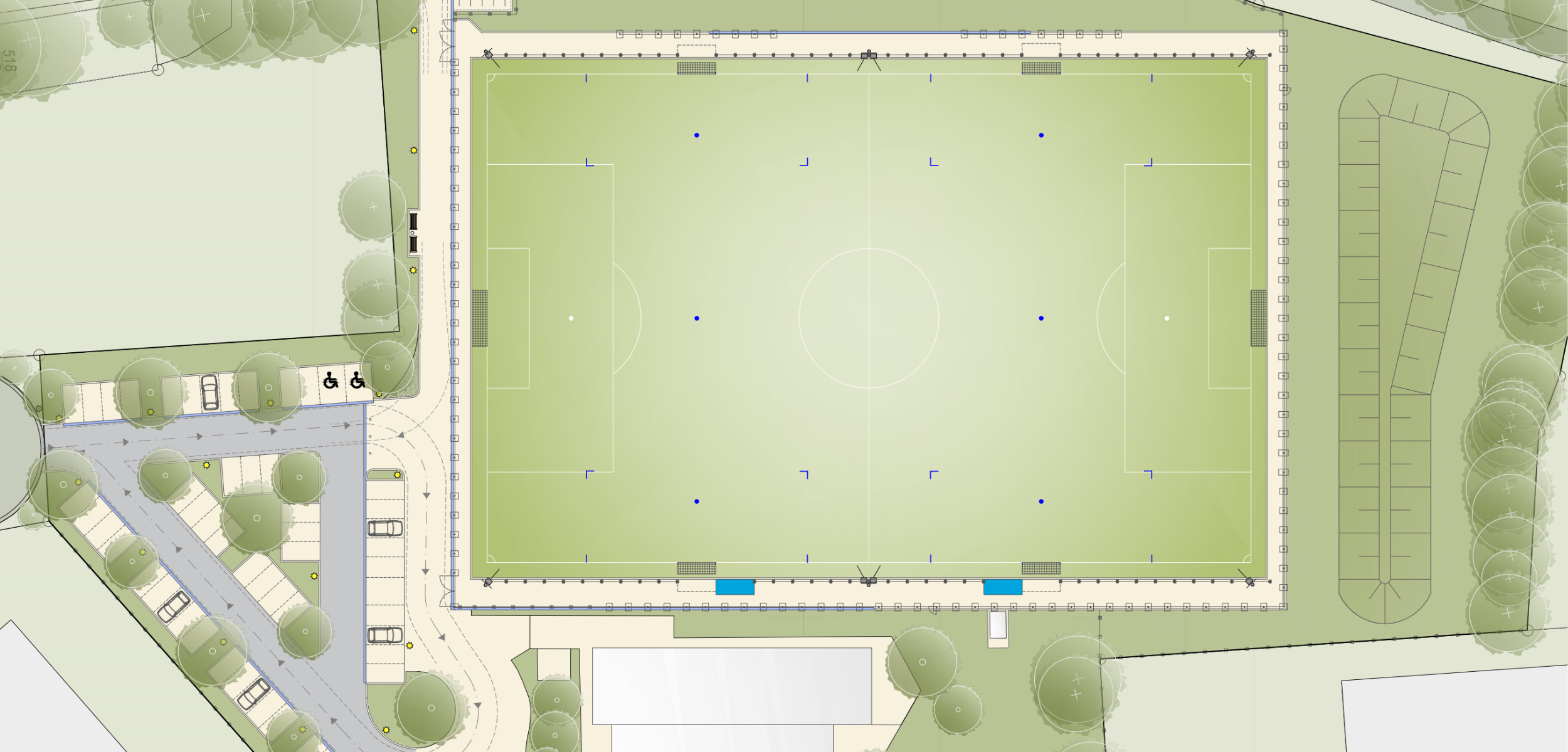 Moderner Kunststoffrasenplatz mit Parkplatz