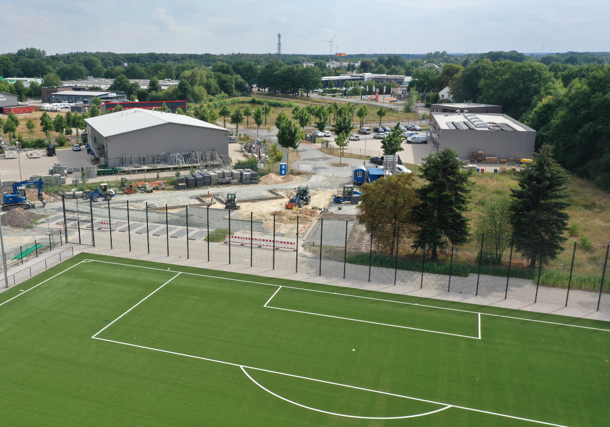 In Delmenhorst entstand neben einer neugebauten Kita ein neuer Kunststoffrasenplatz mit umlaufendem Weg, Ballfangeinrichtungen und Zäunen um die gesamte Anlage. Zudem wurde ein neues Beleuchtungskonzept für die Wegeverbindungen und den Parkplatz entwickelt.