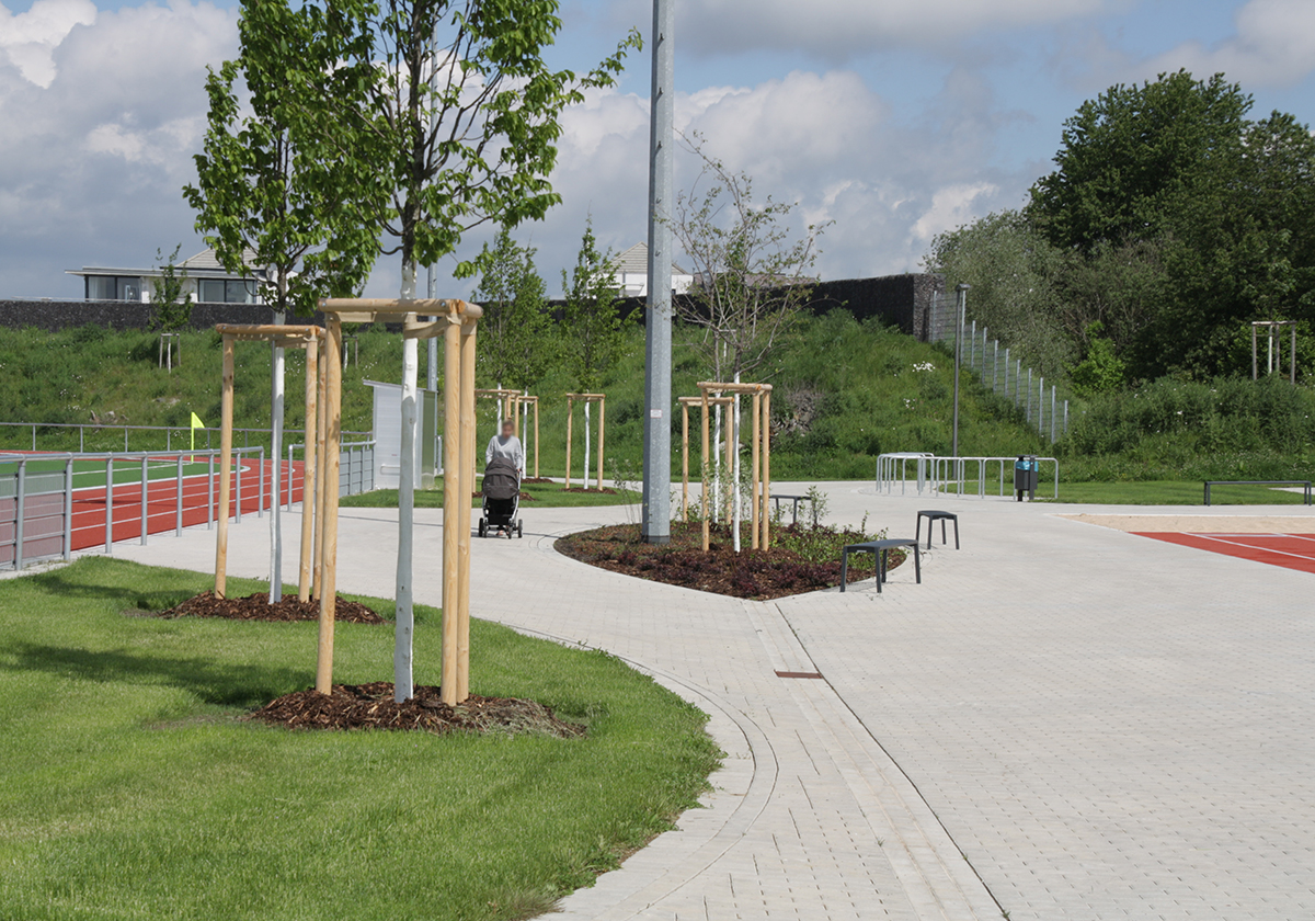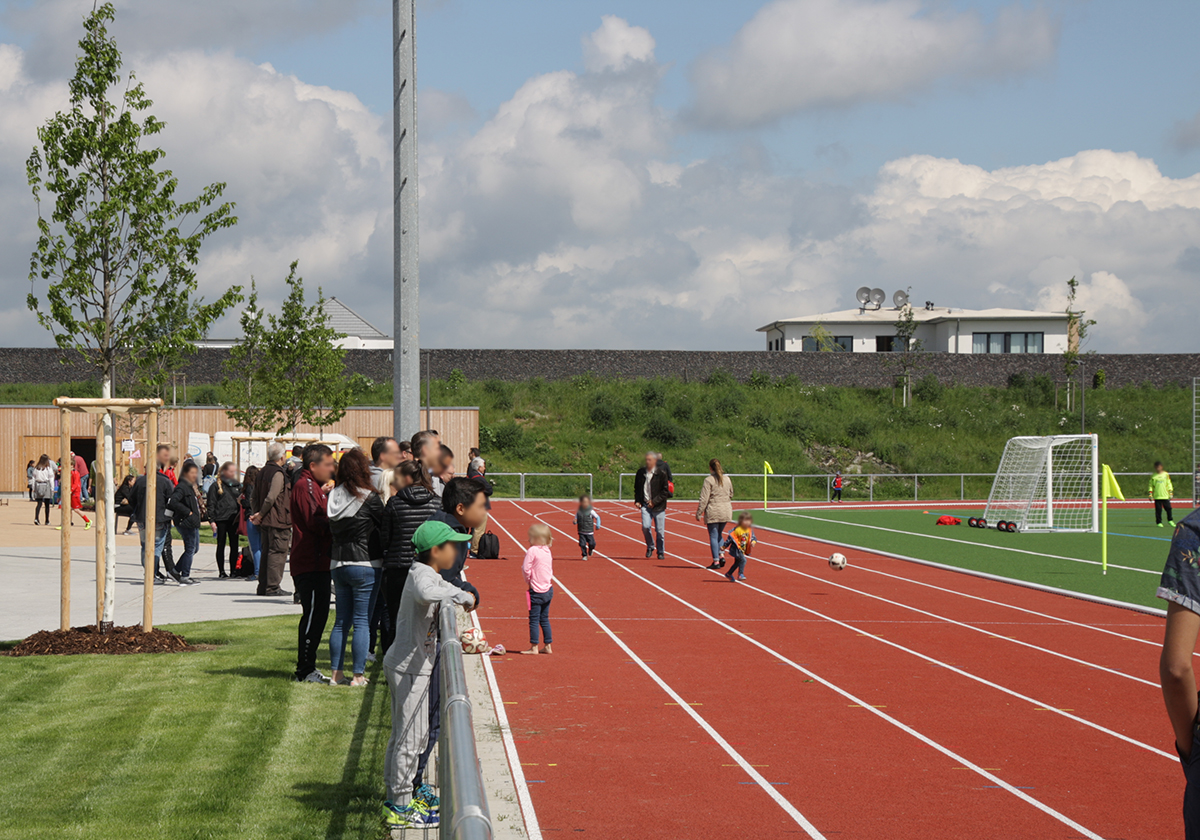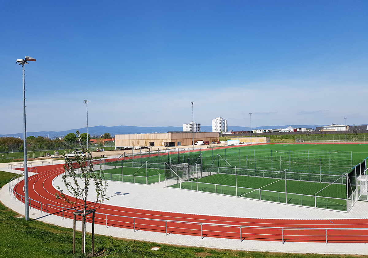 Zu dem ambitionierten Wohnquartierprojekt am Rand des Stadtteils Preungesheim gehört auch die Errichtung eines Sportparks. Die Plätze werden in den natürlichen Geländeverlauf integriert und liegen auf unterschiedlichen Höhenniveaus. Trotzdem erforderte das stark abfallende Gelände die Bewegung von 50.000 m³ Boden.