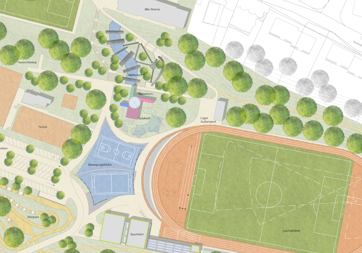 Dazu war im Zentrum der Anlage ein multifunktionaler Sportbereich vorgesehen. Ebenfalls neu wäre eine Kletterwelt mit einem dreigeschossigen Kletterturm gewesen – in der Nähe zum Jugendzentrum „Alte Wanne“. Zudem hätte ein Bikepark für die „Ansprache“ von Kindern und Jugendlichen gesorgt. Zur Konzeption gehörte auch die Umplanung des Bestandes zu einer modernen Wettkampfanlage.