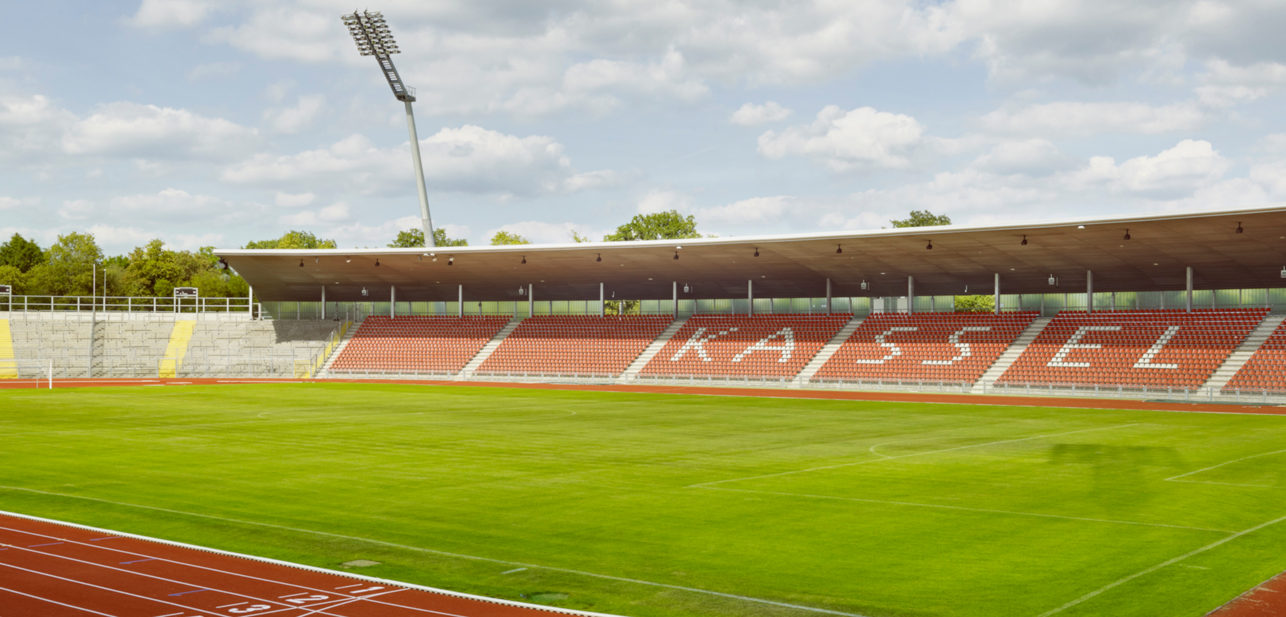 Der Entwurf nimmt auf den nahegelegenen Naturraum der Fulda Rücksicht und betont den Charakter des Stadions als ein in die Landschaft eingebettetes Element. Das architektonische Erscheinungsbild prägen die Tribünenanlagen. Der Stehstufenbereich an der Ostseite wurde neu ausgebaut, der Großteil in eine Sitztribüne umgewandelt.