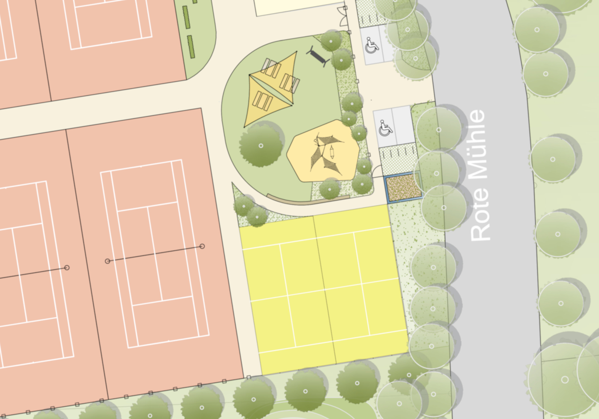 Die Planung von PS+ sieht vor, eine als zusammenhängende und als Sportpark erkennbare Fläche zu schaffen, die die bestehenden Flächen der verschiedenen Nutzergruppen und Vereine integriert und durch weitere Sport -und Freizeitanlagen erweitert. So wurden die Flächen am Tennisplatz mit Padelanlagen ergänzt. Direkt südlich davon sind zwei Pumptrack-Anlagen angeordnet. Im Bereich des Spielfeldes und des Skateparks ist ein multifunktionales Kleinspielfeld mit einer kleinen Calisthenics-Anlage, Aufenthalts- und Sitzmöglichkeiten, sowie eine WC-Anlage geplant.