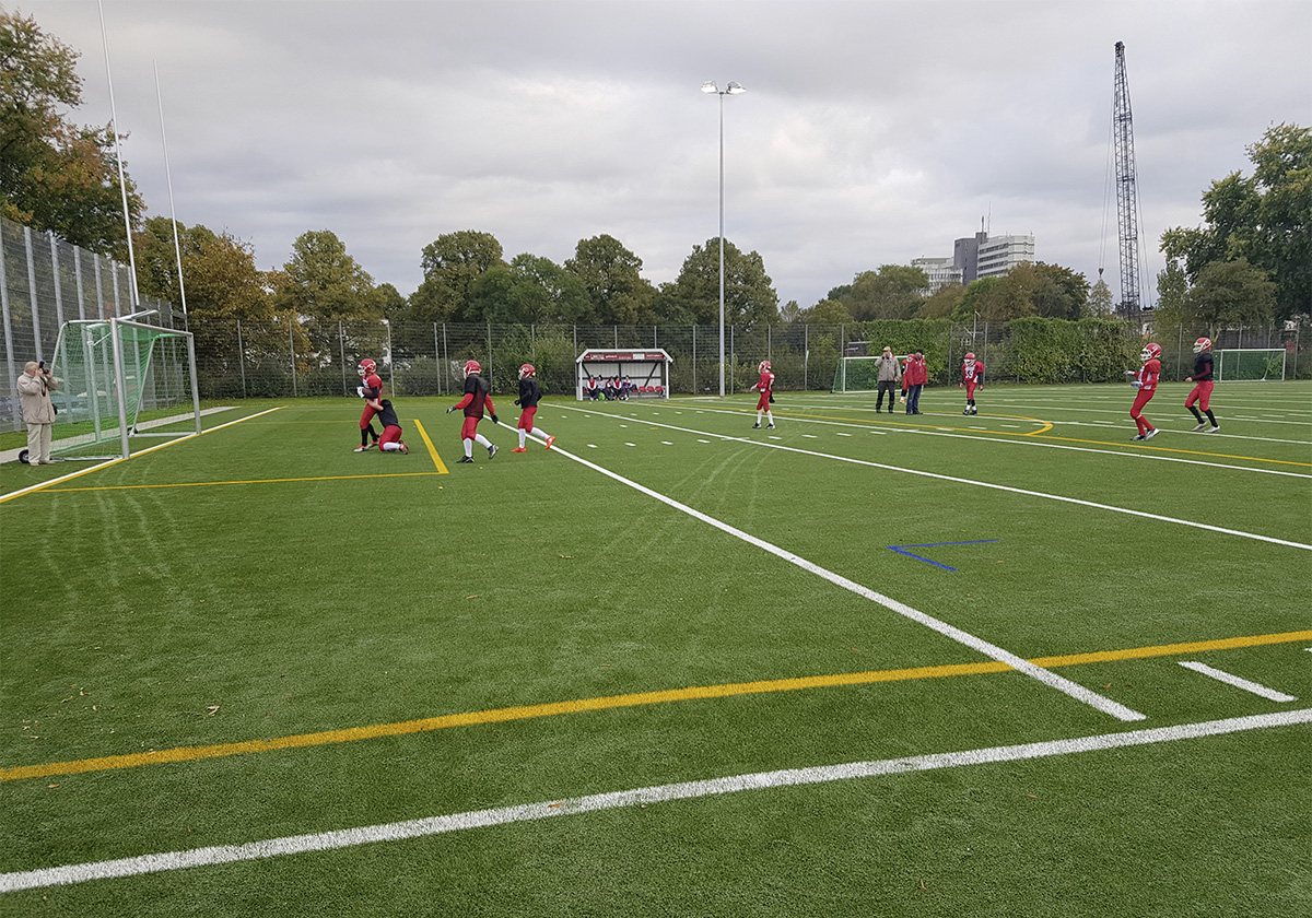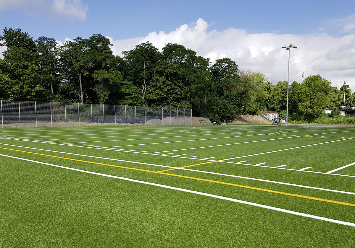 Vor allem besticht das Spielfeld aber durch seine „inneren Werte“: Der Kunststoffrasen ruht auf einem Geotextil und einer bitumiös gebundenen Tragschicht. Absackungen des setzungsempfindlichen Bodens lassen sich korrigieren. Die zuvor nötigen Baugrunduntersuchungen führte das Prüflabor GEOVEGOS durch.