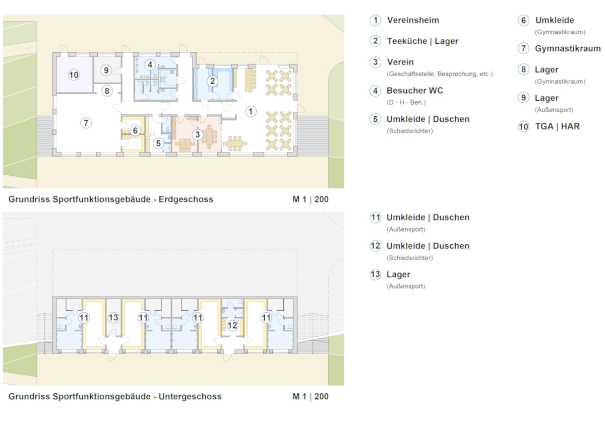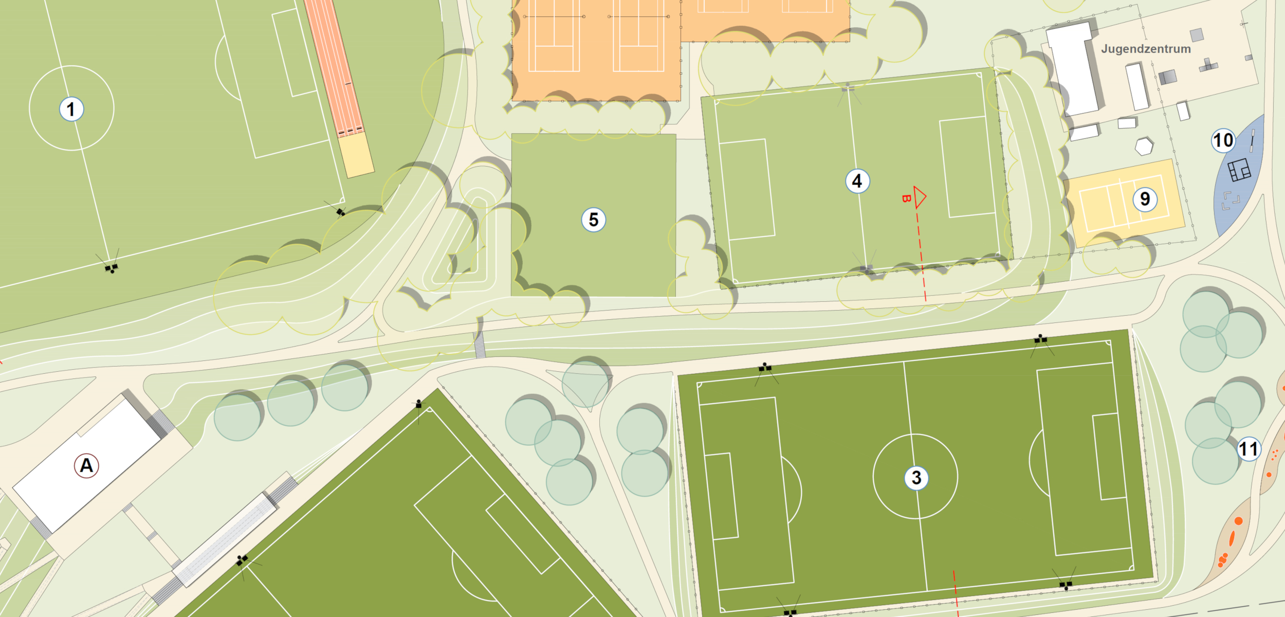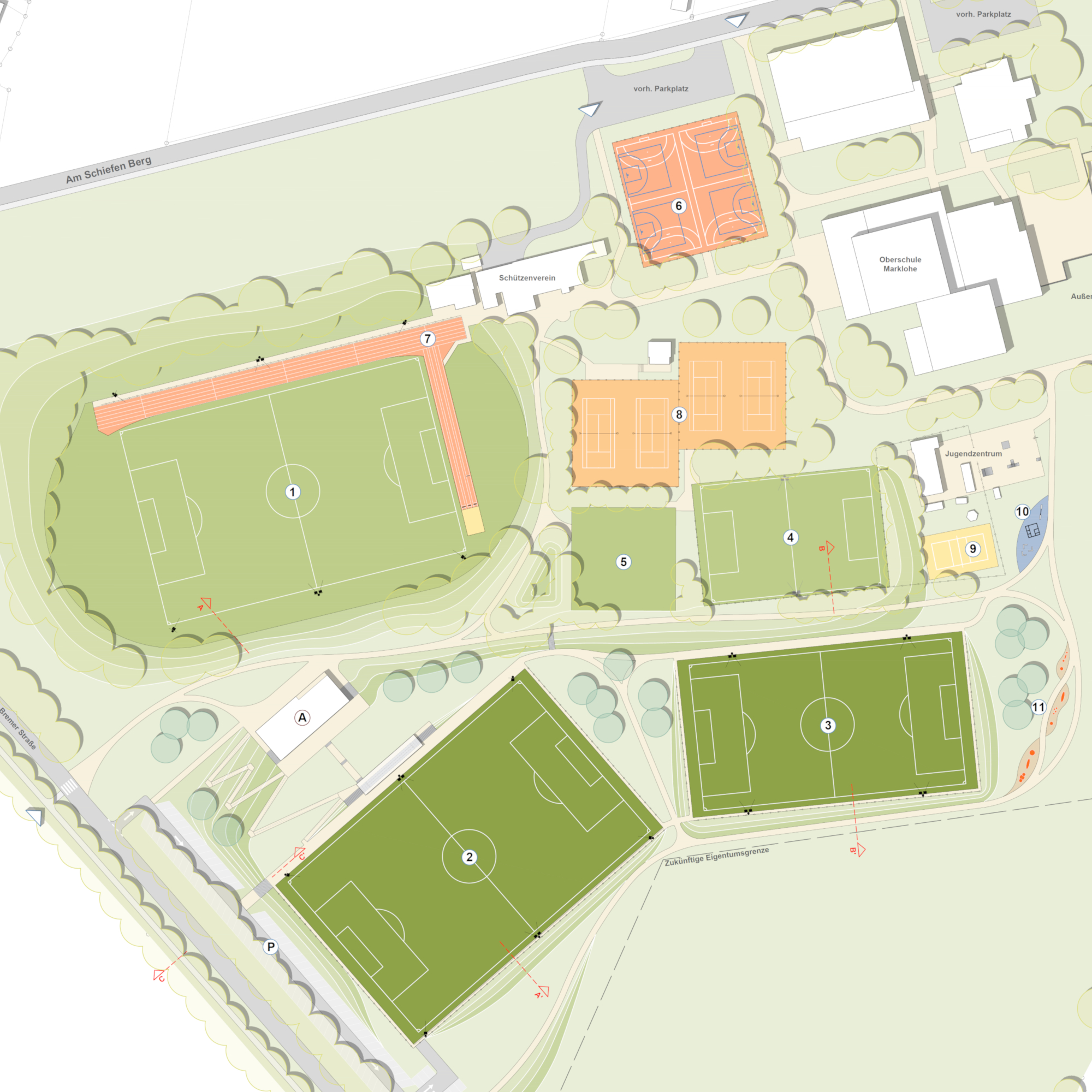 Dies floss wie die Planung der Sportflächen in die Ermittlung der Kostenrichtwerte ein. In vier Varianten wurden parkähnliche Anordnungsvorschläge für zwei Rasenspielfelder, ein Beachfeld, Einrichtungen für Parcours und Calisthenics, für Outdoorfitnessgeräte, ein multifunktionales Kunststofffeld und ein Vereinsheim mit überdachter Tribüne sowie PKW-Stellplätze erarbeitet.