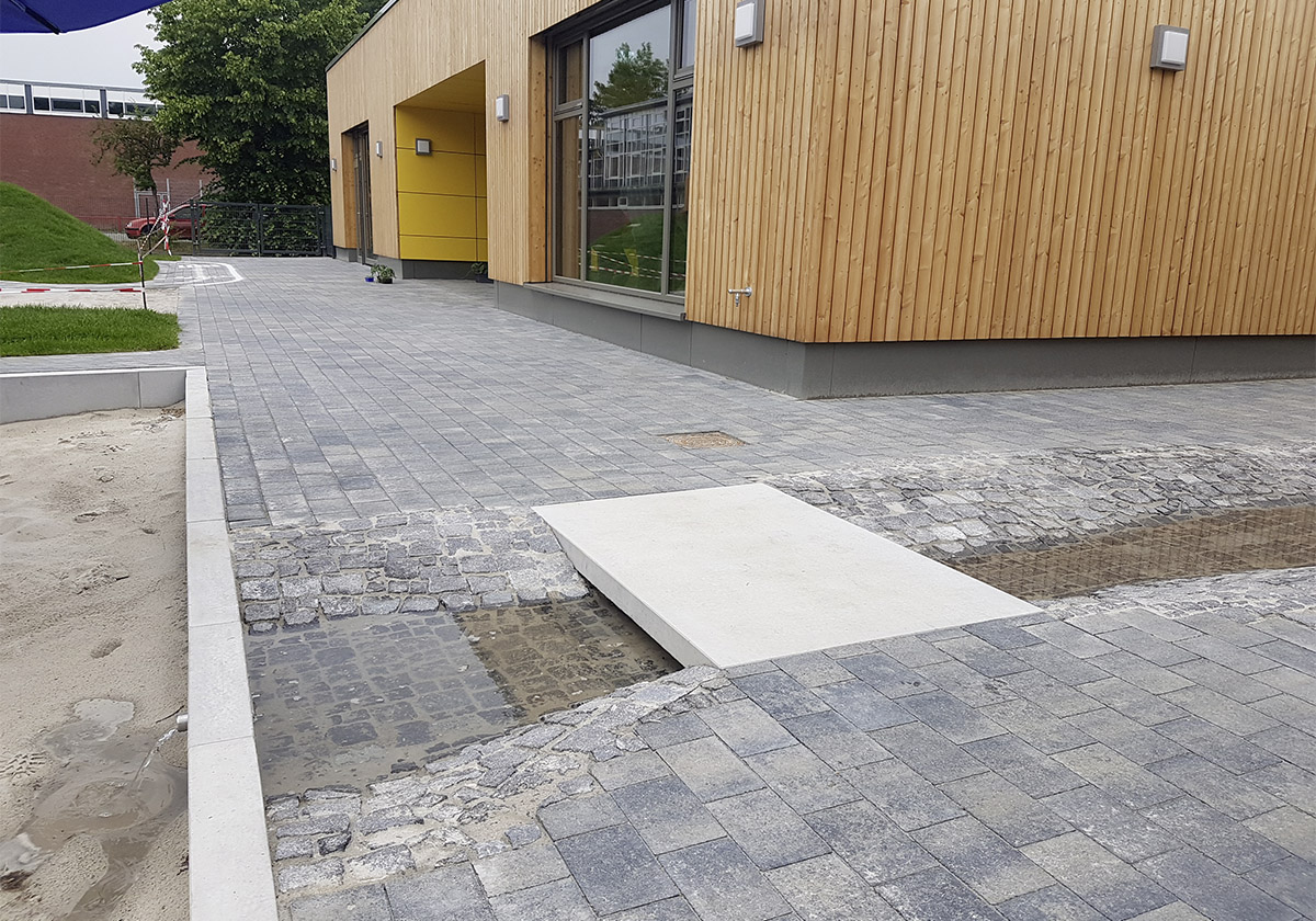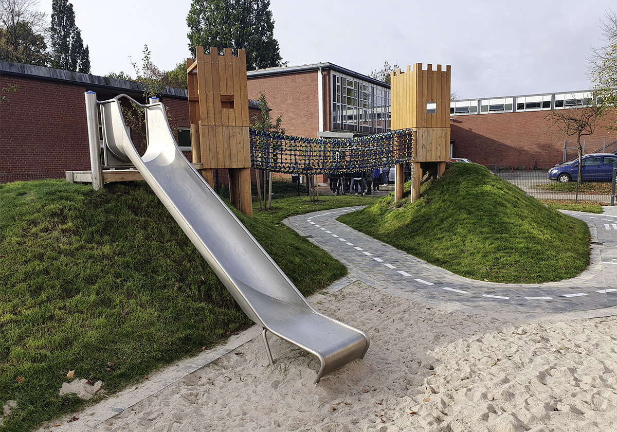 Großer Beliebtheit erfreut sich die gepflasterte Bobbycar-Rennstrecke. Darüber hinaus wurden eine Wasserspielanlage und ein Matschbereich angelegt. Drei Kletterhügel mit Spielgeräten lockern den Außenbereich auf. Nicht nur zur Auflockerung dient die „eingestreute“ Bepflanzung: die Naschgehölze laden auch zum Pflücken und Essen ein.
