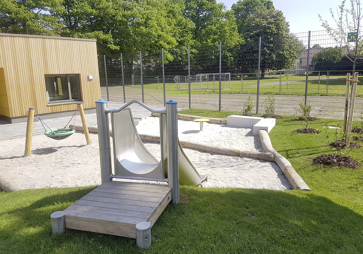 Die von Pätzold + Snowadsky geplanten Außenanlagen der Kinderbetreuungseinrichtung an der Sachsenstraße bieten vielfältigste Möglichkeiten für das freie Spiel an der frischen Luft. Sie wurden beim Neubau der Kindertagesstätte angelegt und sprechen kleine und größere Kinder gleichermaßen an.