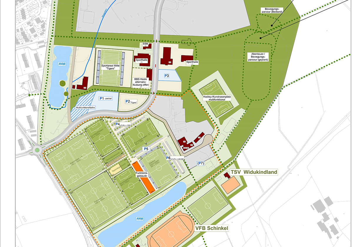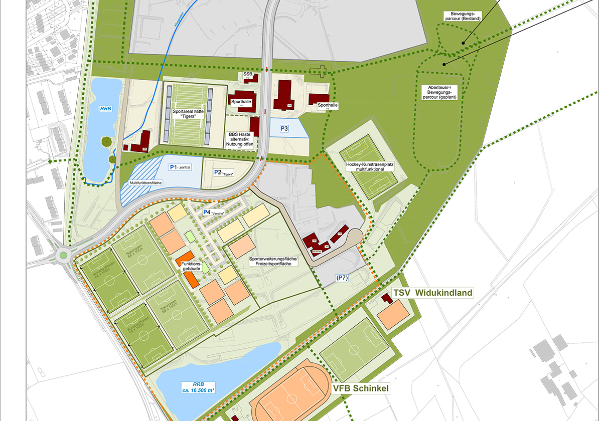 Zudem wurden in einer Marktrecherche potenzielle kommerzielle Nutzungen abgefragt – ohne Nachfrageergebnis. Für das Areal sah die Konzeptstudie eine Mischnutzung aus vereins- und nicht vereinsgebundenen Sport vor. Neben einem Vereinssportzentrum mit Rasen- und Kunstrasenspielfeldern schlug sie u.a. eine beleuchtete Laufstrecke, einen Fitnessparcours sowie Grünflächen für Trendsportarten vor. Zudem wurde in einer Variante ein Leistungszentrum für den VfL Osnabrück integriert.