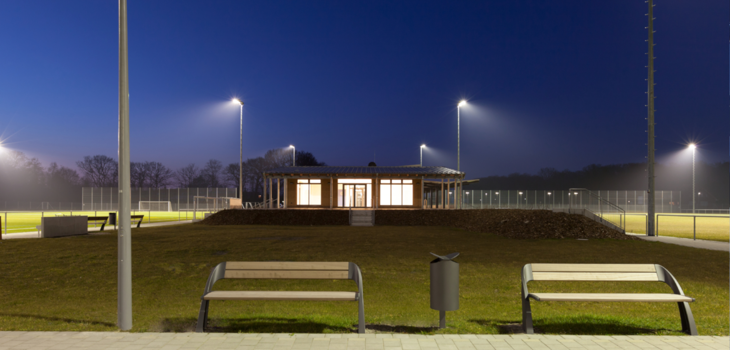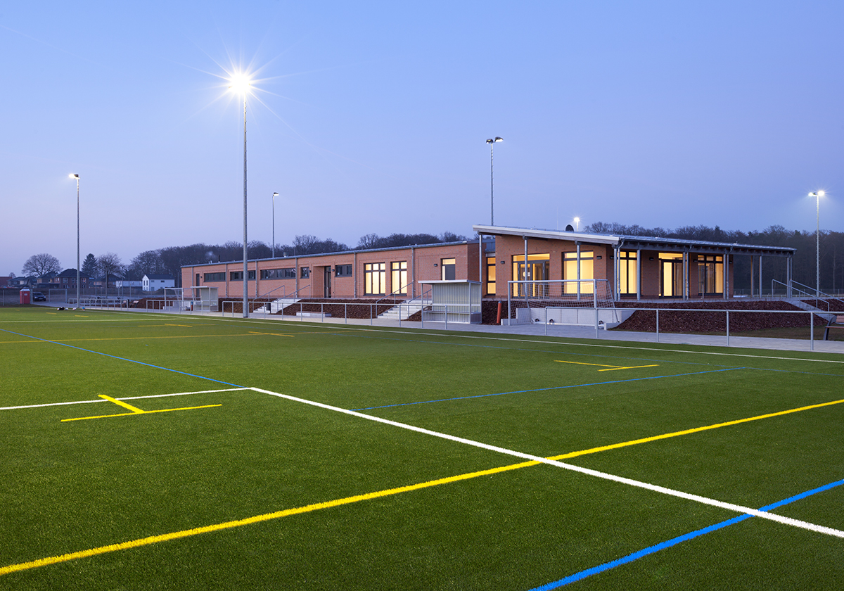 Den Mittelpunkt der Anlage bildet das Funktionsgebäude, das auch ein Vereinsheim mit überdachter Außenterrasse umfasst. Zwei Großspielfelder weisen einen Naturrasen auf. Der dritte Platz ist mit einem Kunststoffrasenbelag ausgestattet. Absolut blendungsfrei arbeitet die Sportstättenbeleuchtung des an die Bundesautobahn 29 grenzenden Sportzentrums.