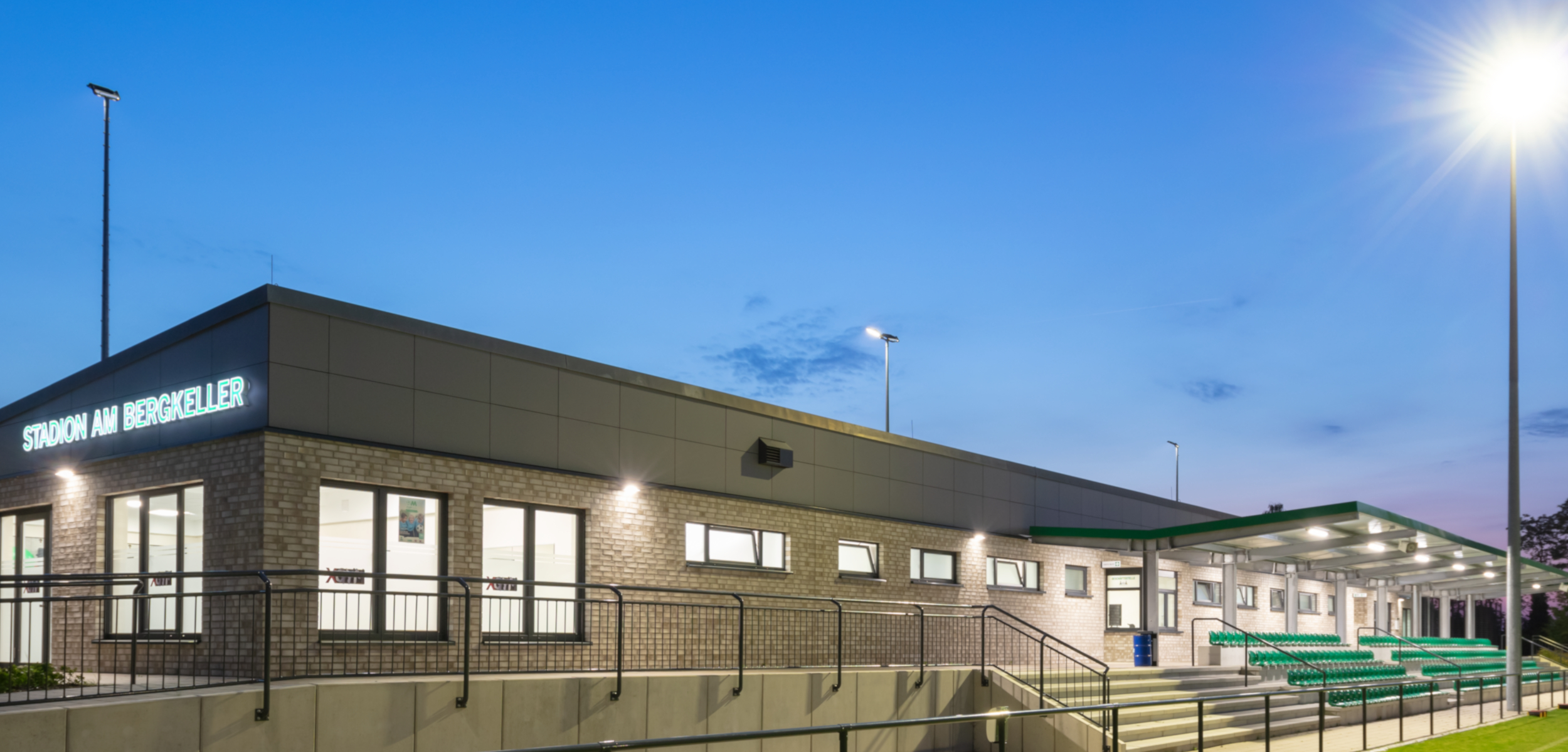 Es weist neben Vereinsräumen und Umkleiden auch eine überdachte Tribüne mit Blick auf den Hauptplatz mit Naturrasen auf. Die vom Platz zum Gebäude führende Treppe bietet gleichzeitig Raum für Stehplätze. Die Planungen erfolgten in Abstimmung mit dem Verein. Neben Funktionalität und Barrierefreiheit war dabei auch die Wirtschaftlichkeit des Neubaus zu berücksichtigen.