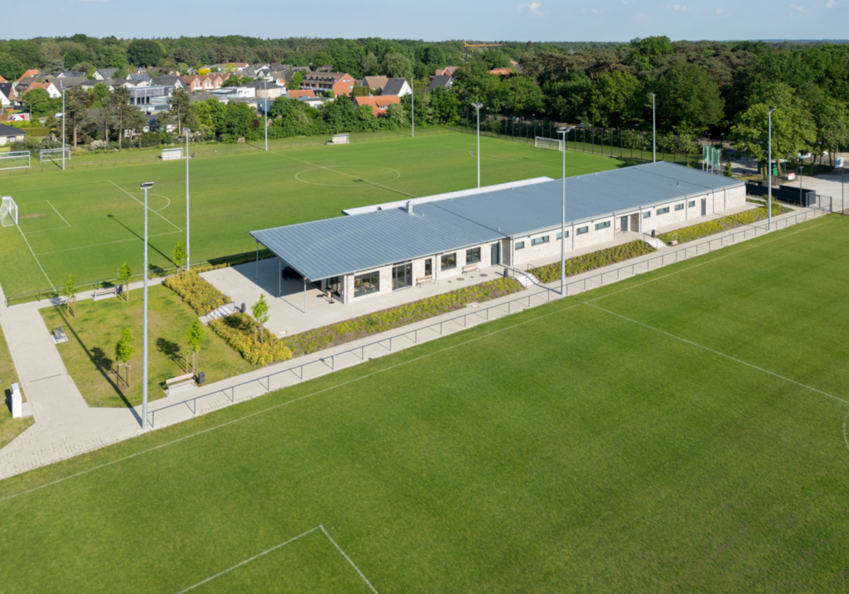 Es weist neben Vereinsräumen und Umkleiden auch eine überdachte Tribüne mit Blick auf den Hauptplatz mit Naturrasen auf. Die vom Platz zum Gebäude führende Treppe bietet gleichzeitig Raum für Stehplätze. Die Planungen erfolgten in Abstimmung mit dem Verein. Neben Funktionalität und Barrierefreiheit war dabei auch die Wirtschaftlichkeit des Neubaus zu berücksichtigen.