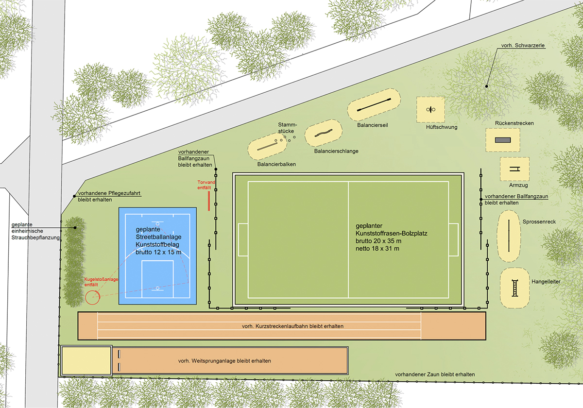 Zum „Bolzen“ stehen Kindern und Jugendlichen nun ein Kleinspielfeld mit Kunststoffrasen sowie ein Streetballfeld zur Verfügung. Es besitzt ebenfalls einen Kunststoffbelag. Geschicklichkeit und Fitness fördert ein neuer Geräteparcours. Bis auf die Kugelstoßanlage blieben die leichtathletischen Einrichtungen erhalten.