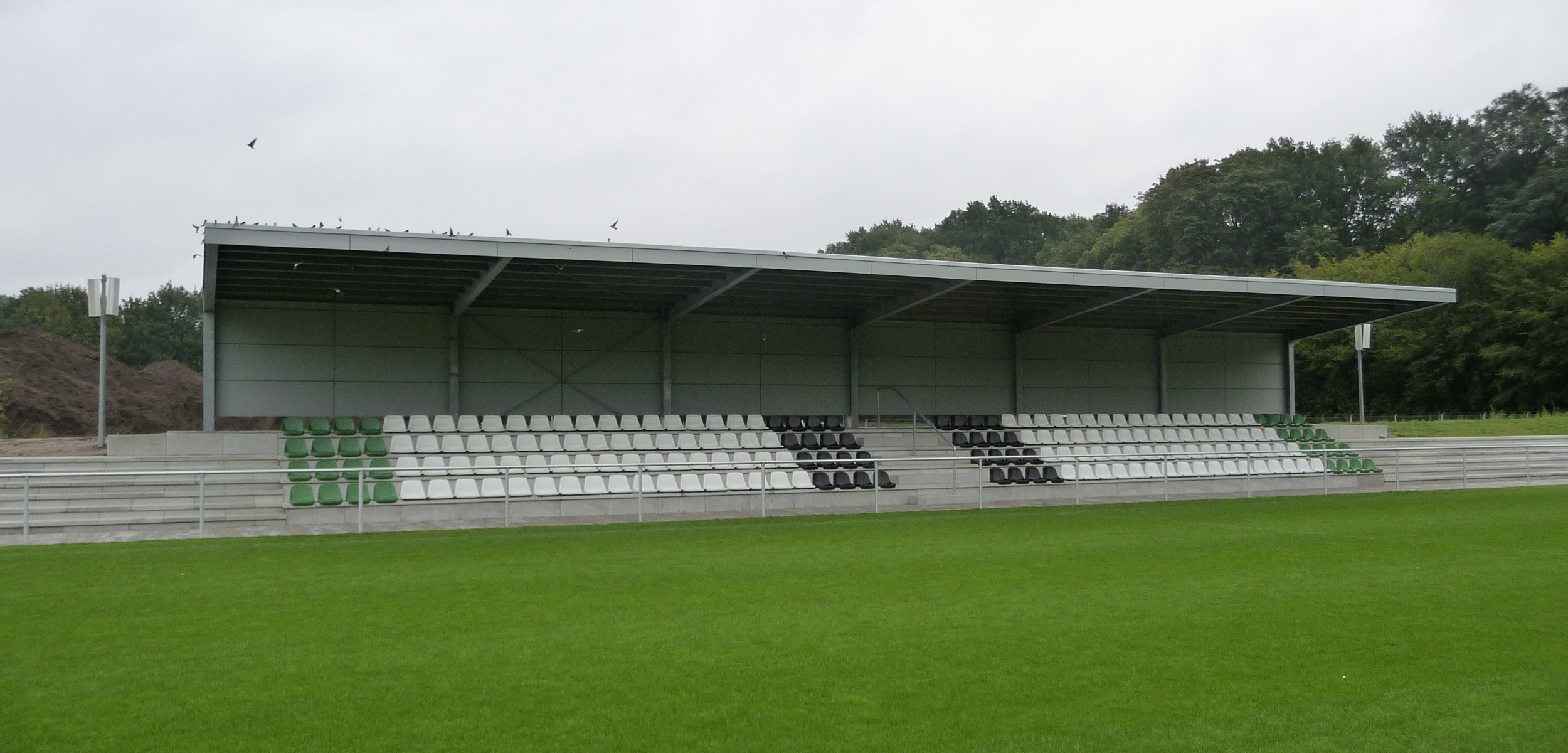 Den Sitzbereich schützt eine Überdachung vor Witterungseinflüssen. Er ist mit in Vereinsfarben gehaltenen Sitzschalen ausgestattet und liegt mittig an der Ostseite des Stadions. Die gesamte Tribünenanlage ist wirtschaftlich aus einheitlichen Betonfertigelementen gebaut worden.
