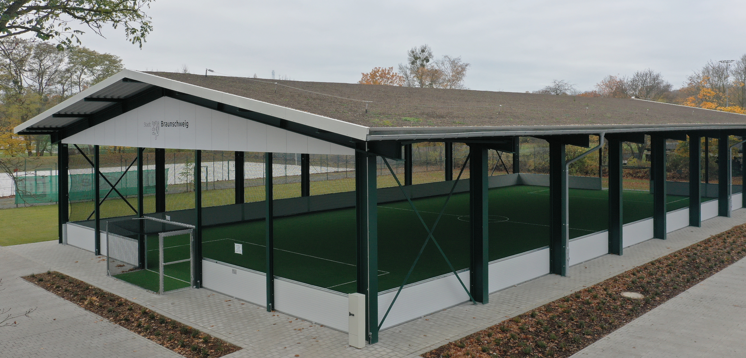 Gleich auf vier verschiedenen Braunschweiger Sportanlagen werden die vom Planungsbüro PS+ geplanten Freilufthallen realisiert. Mit dem Bau der Hallen wurde im Herbst 2020 begonnen. Die Freilufthallen sind für den Fußballsport ausgelegt und sollen zur Entlastung der konventionellen Mehrfach-Sporthallen beitragen.