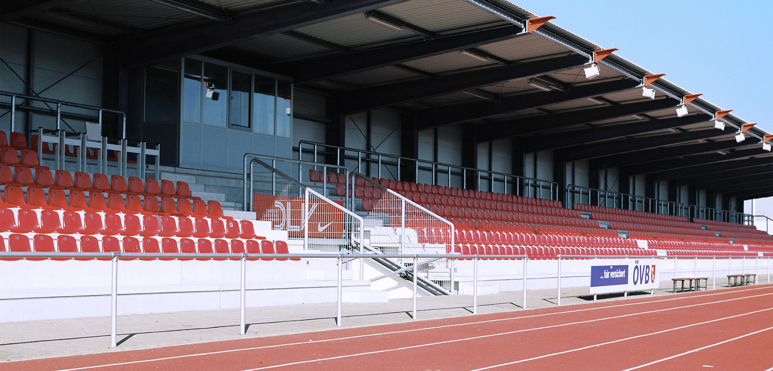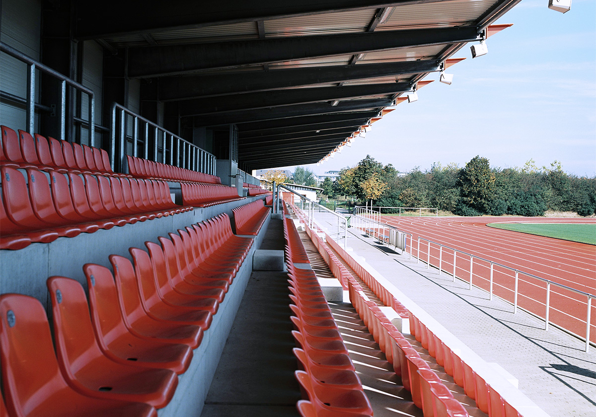 Architektonisch bestimmend ist die für 1.500 Zuschauer ausgelegte Tribüne. In ihrem Inneren erstreckt sich ein Laufschlauch zu Trainingszwecken. Ihr Aufbau besteht aus einer Stahlkonstruktion mit aufgelegten Betonfertigteilstufen. Großer Wert wurde auf die Barrierefreiheit der Anlage gelegt.