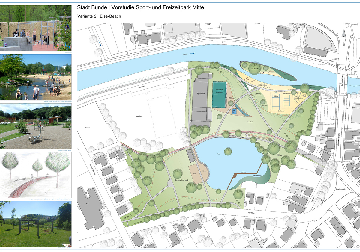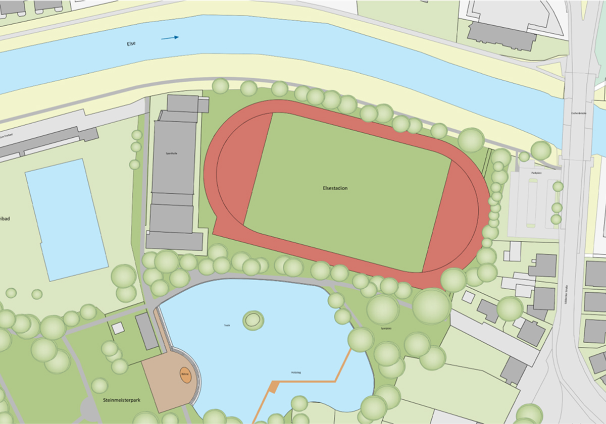 Kann der Sport- und Freizeitwert im Innenstadtbereich erhöht und der Fluss Else erlebbar gemacht werden? Wie diese Planungsziele realisiert werden können, war Gegenstand einer von PS+ durchgeführten Machbarkeitsstudie. Diese untersuchte den von der Stadt Bünde auserkorenen Standort des Elsestadions und unterbreitete zwei Vorschläge für die Umgestaltung.