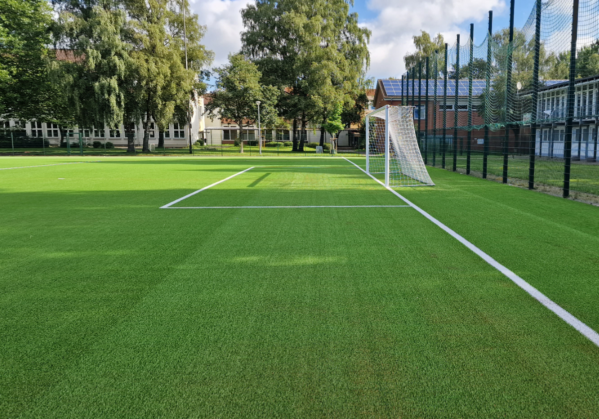 Passend zum Beginn des neuen Schuljahres konnte der neue Kunststoffrasen mit Sand- und Korkverfüllung wieder in Nutzung gehen -Schülerschaft der angrenzenden Schule und der Fußballverein waren begeistert und freuten sich auf den Sportbetrieb!