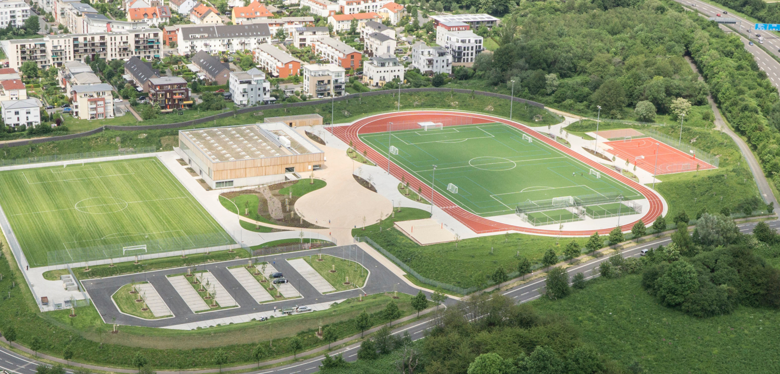 Zu dem ambitionierten Wohnquartierprojekt am Rand des Stadtteils Preungesheim gehört auch die Errichtung eines Sportparks. Die Plätze werden in den natürlichen Geländeverlauf integriert und liegen auf unterschiedlichen Höhenniveaus. Trotzdem erforderte das stark abfallende Gelände die Bewegung von 50.000 m³ Boden.