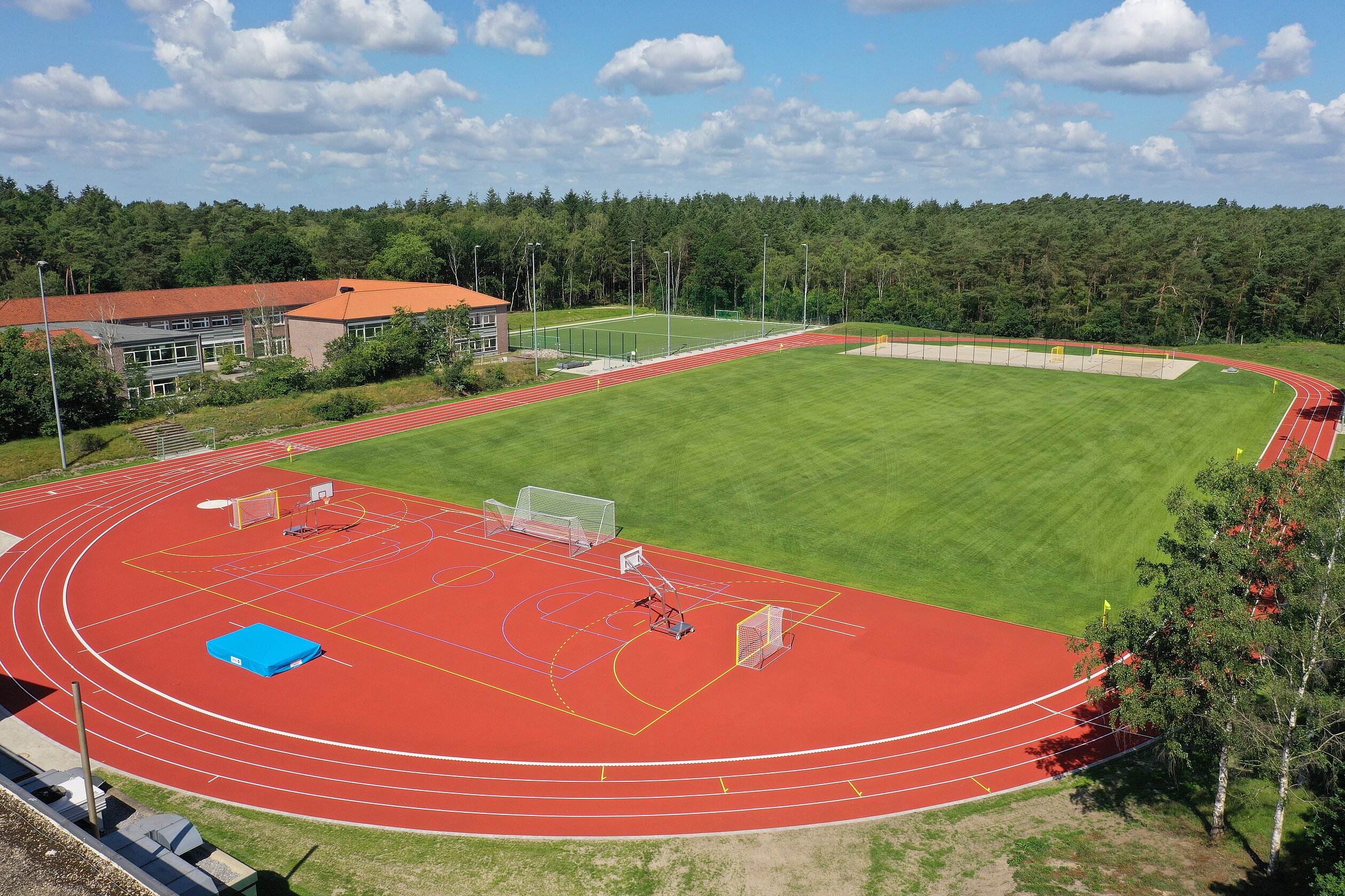 Eingebettet im Wald befindet sich die gleichnamige „Waldschule“ von Hatten. Die an die Schule angrenzende Sportanlage wurde nun, unterstützt mit europäischen Fördermitteln, umfangreich saniert. Im Fokus der Sanierung stand von Beginn an die Multifunktionalität der öffentlich zugängigen Anlage, da sie der Schule, den Vereinen und der Öffentlichkeit zur Verfügung steht. Neben der Rundlaufbahn und dem Naturrasengroßspielfeld mit automatischer Beregnungsanlage wurden in den Segmenten unterschiedliche Sporträume realisiert. In den Segmenten stehen nun neben der Kugelstoßanlage auch ein Beachvolleyball- und ein Beachhandballfeld zur Verfügung. Darüber hinaus können neben den klassischen Leichtathletikdisziplinen wie Stabhochsprung, Diskuswurf, Speerwurf und Hochsprung auch Basketball- und Handballsport ausgeübt werden. Ein beleuchtetes Kunststoffrasenspielfeld und ein Boulplatz ergänzen das Angebot.