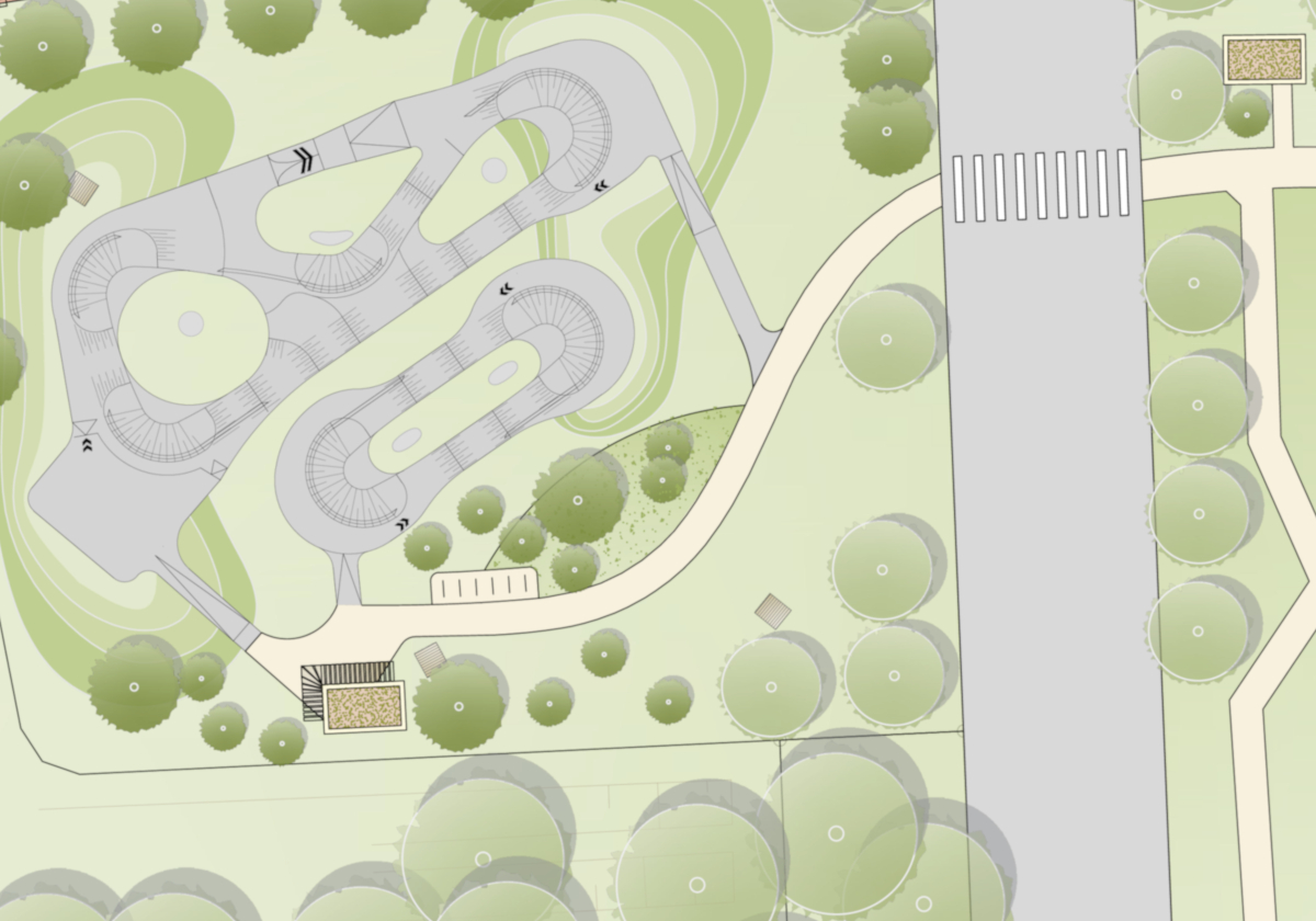 Die Planung von PS+ sieht vor, eine als zusammenhängende und als Sportpark erkennbare Fläche zu schaffen, die die bestehenden Flächen der verschiedenen Nutzergruppen und Vereine integriert und durch weitere Sport -und Freizeitanlagen erweitert. So wurden die Flächen am Tennisplatz mit Padelanlagen ergänzt. Direkt südlich davon sind zwei Pumptrack-Anlagen angeordnet. Im Bereich des Spielfeldes und des Skateparks ist ein multifunktionales Kleinspielfeld mit einer kleinen Calisthenics-Anlage, Aufenthalts- und Sitzmöglichkeiten, sowie eine WC-Anlage geplant.
