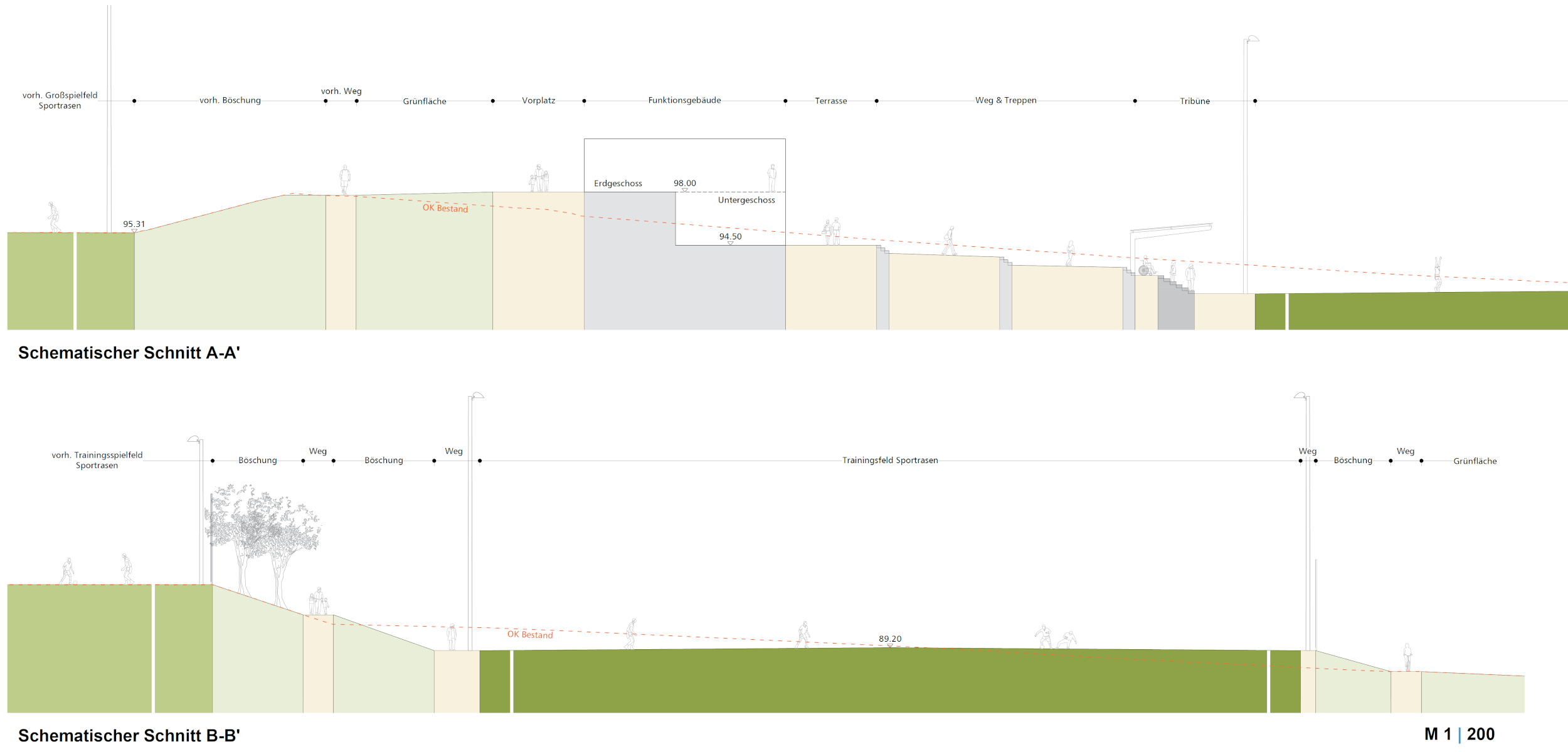 Dies floss wie die Planung der Sportflächen in die Ermittlung der Kostenrichtwerte ein. In vier Varianten wurden parkähnliche Anordnungsvorschläge für zwei Rasenspielfelder, ein Beachfeld, Einrichtungen für Parcours und Calisthenics, für Outdoorfitnessgeräte, ein multifunktionales Kunststofffeld und ein Vereinsheim mit überdachter Tribüne sowie PKW-Stellplätze erarbeitet.