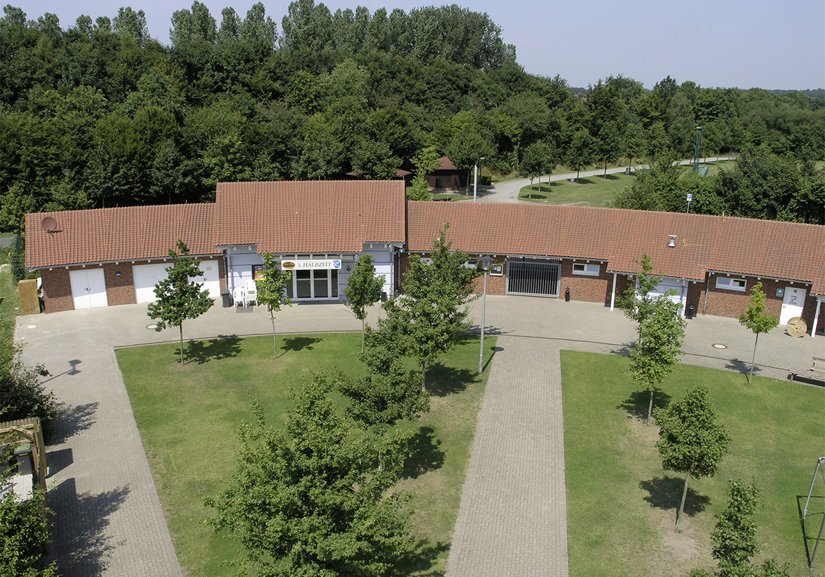 Das "Stadion" passt sich in die Umgebung ein und öffnet sich vom Vorplatz über den mit Blendmauerwerk versehenen Mehrzweckbau bis zu den Sportflächen. Architektonisch prägend ist das bogenförmige Gebäude, das neben Umkleiden auch Räume für Schulungen und Vereinsveranstaltungen bereithält.