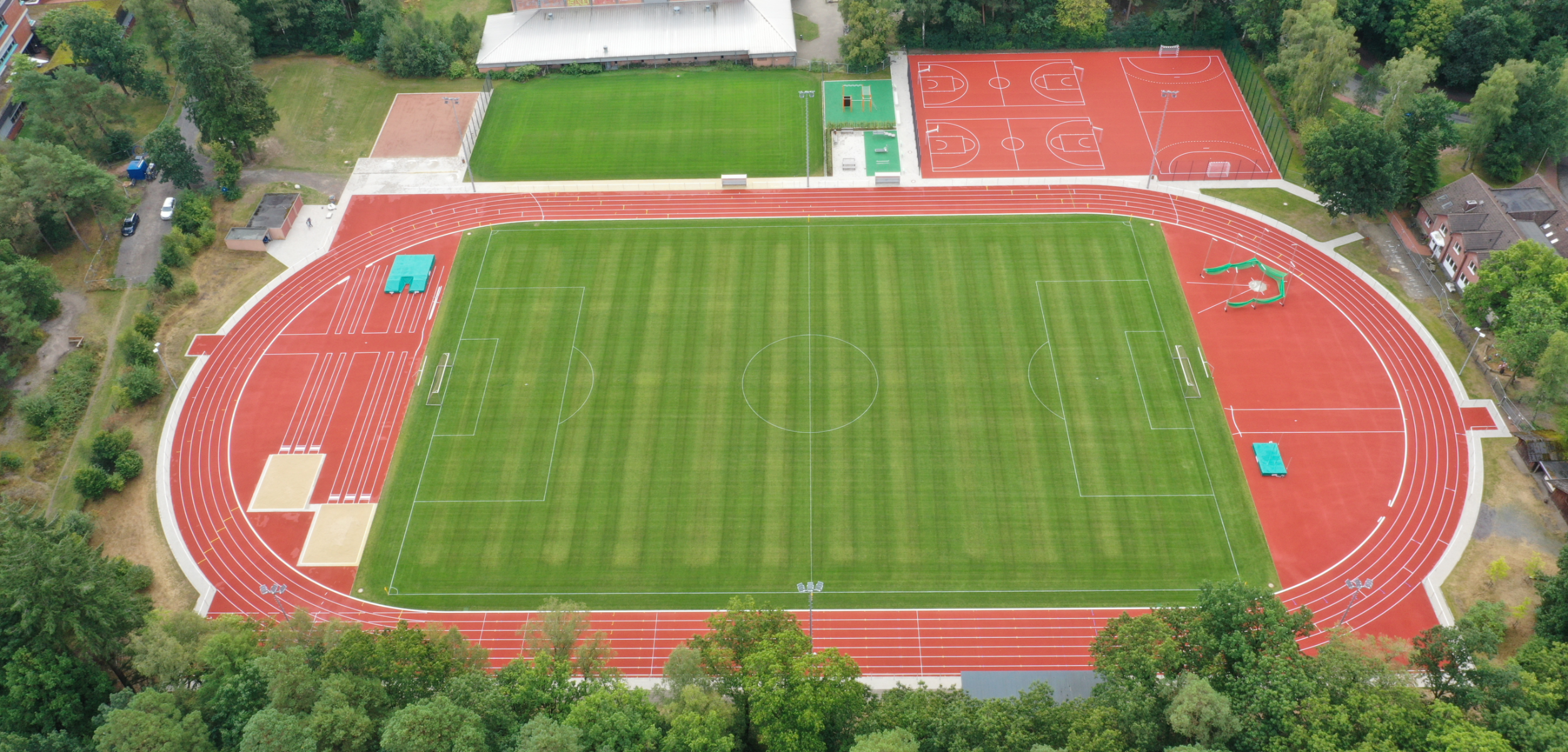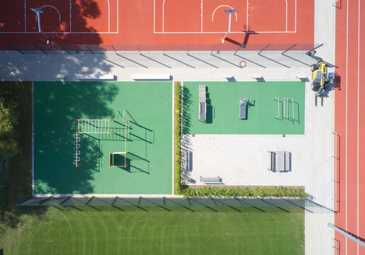 Bereits 2021 wurde das Büro für die erste Stufe der Planung zur umfangreichen Modernisierung des Stadions beauftragt. Diese und die späteren Planungen umfassten die vollständige Modernisierung der gesamten Anlage einschließlich der Berücksichtigung neuer zeitgemäßer Sportflächen und Sportangebote wie Fitnessgeräte und eine Calisthenics-Anlage. Die Flächen sind multifunktional nutzbar. So enthält das große Fußballspielfeld zusätzlich auch Tore und Möglichkeiten für Football-Spiele und -Trainings. Die neue Beleuchtung ermöglicht eine hohe Nutzungsfrequenz der Sportangebote. In Punkto Versickerung konnten wir eine Rigole planen, die zukünftig anfallendes Wasser zeitverzögert versickern lässt.
