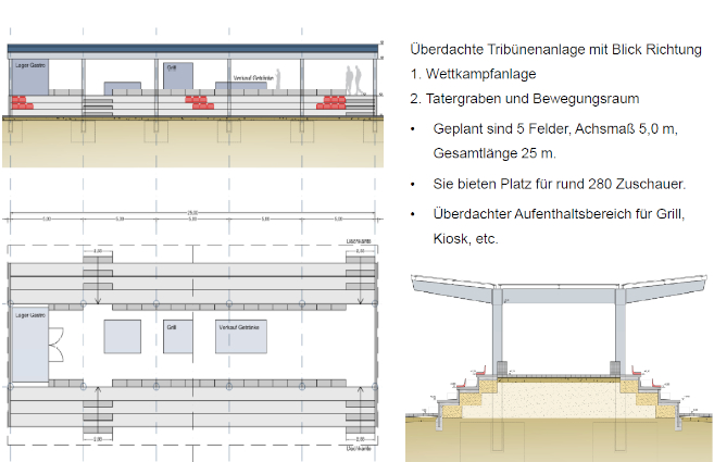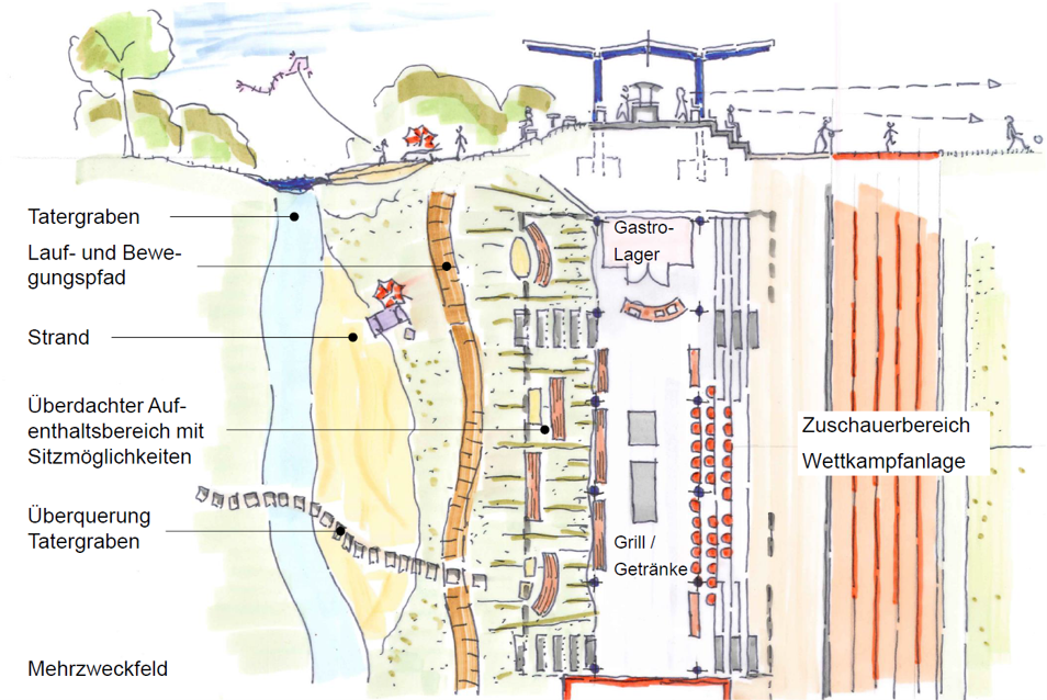 Sie soll nicht allein dem Schul- und Vereinssport vorbehalten sein, sondern auch für die Öffentlichkeit attraktive Freizeitsportangebote bereitstellen. Hohe Aufenthaltsqualität würde durch die Wiederbelebung eines Bachlaufs erzielt. Mit dem Vereins- und Bewegungszentrum erhielte das weitläufige Areal einen multifunktionalen, architektonischen Mittelpunkt.