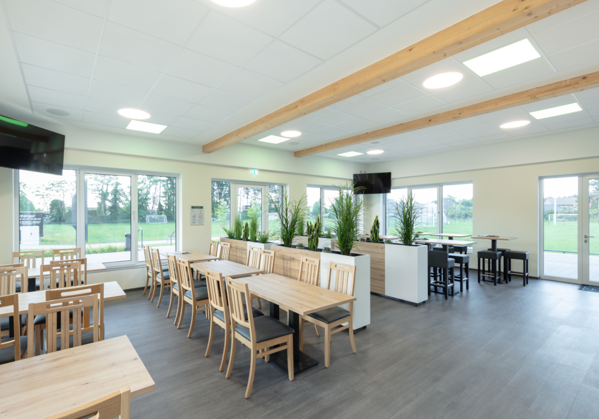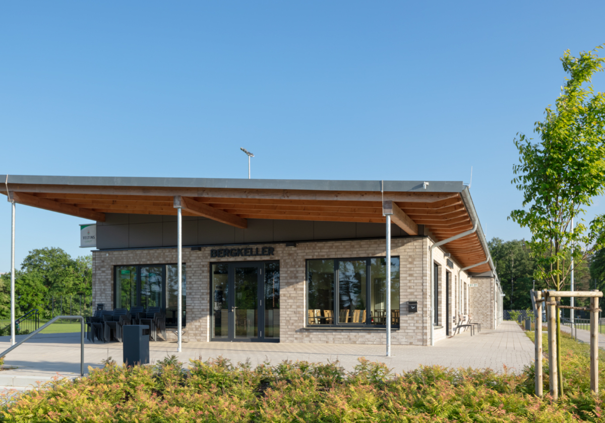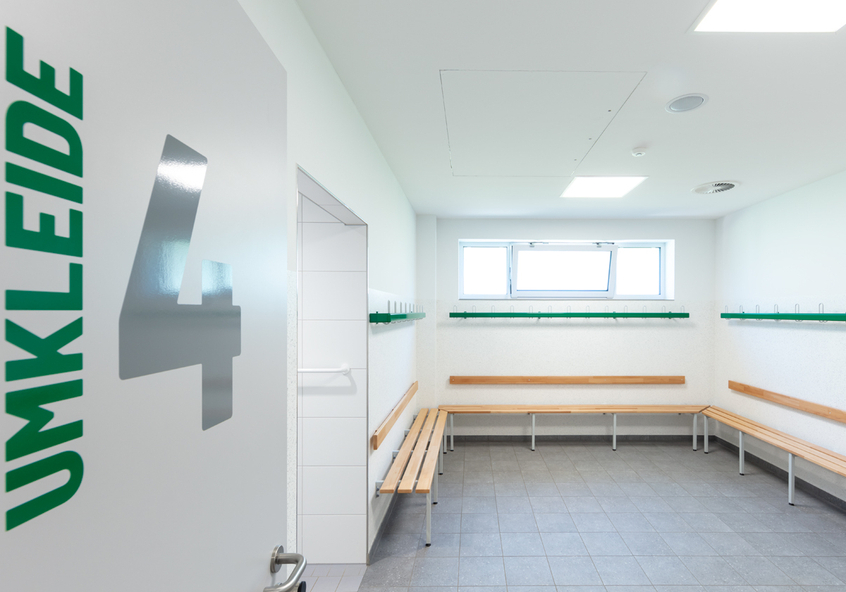 Es weist neben Vereinsräumen und Umkleiden auch eine überdachte Tribüne mit Blick auf den Hauptplatz mit Naturrasen auf. Die vom Platz zum Gebäude führende Treppe bietet gleichzeitig Raum für Stehplätze. Die Planungen erfolgten in Abstimmung mit dem Verein. Neben Funktionalität und Barrierefreiheit war dabei auch die Wirtschaftlichkeit des Neubaus zu berücksichtigen.