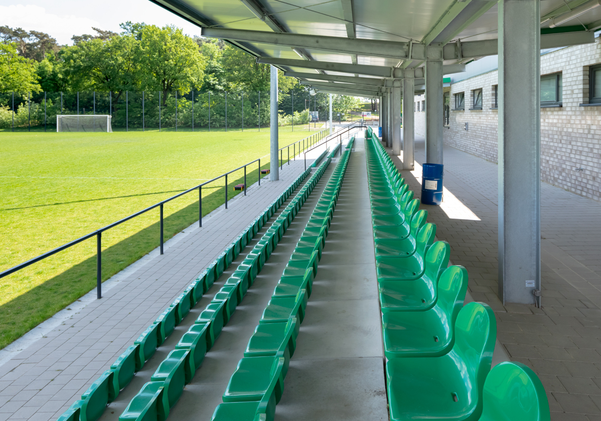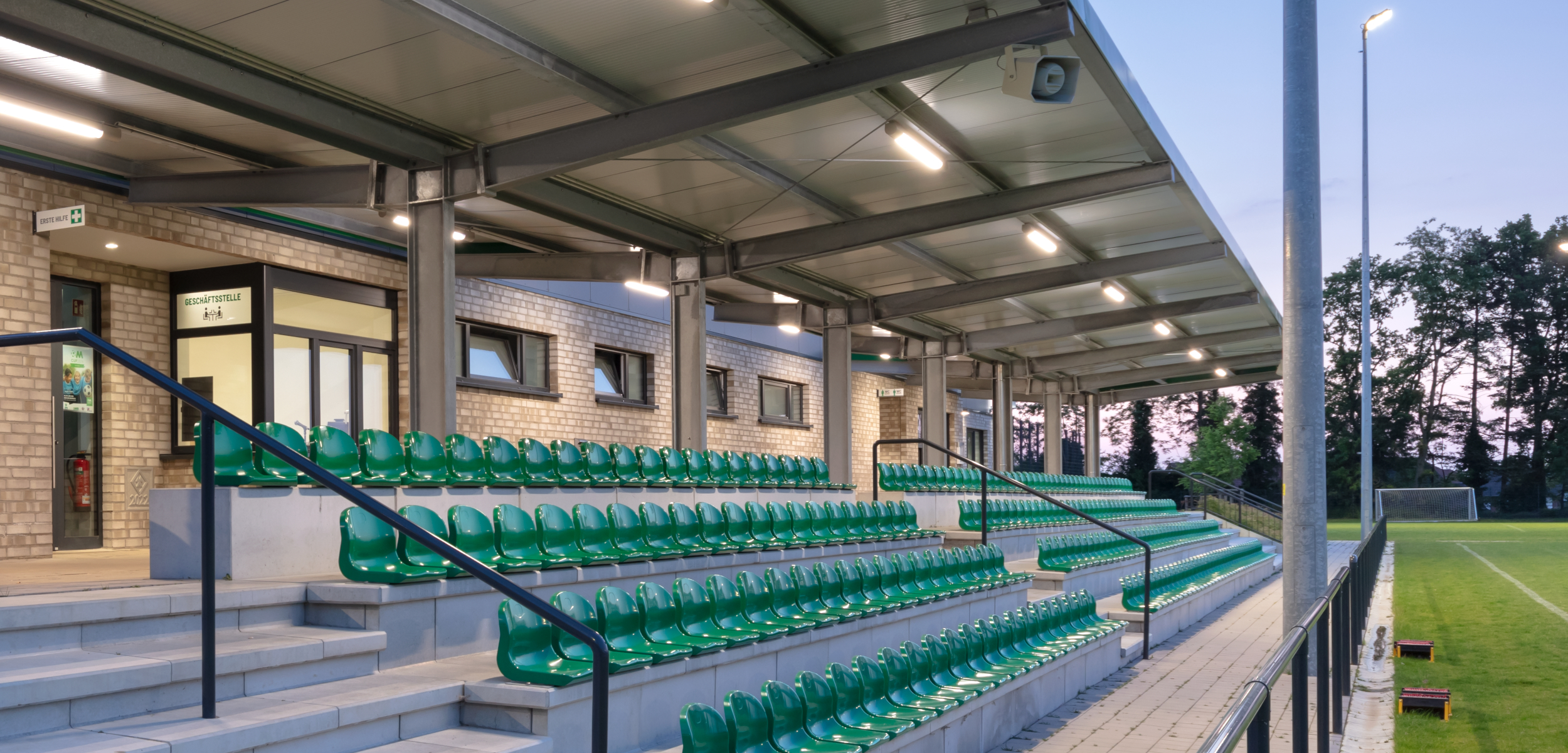 Es weist neben Vereinsräumen und Umkleiden auch eine überdachte Tribüne mit Blick auf den Hauptplatz mit Naturrasen auf. Die vom Platz zum Gebäude führende Treppe bietet gleichzeitig Raum für Stehplätze. Die Planungen erfolgten in Abstimmung mit dem Verein. Neben Funktionalität und Barrierefreiheit war dabei auch die Wirtschaftlichkeit des Neubaus zu berücksichtigen.